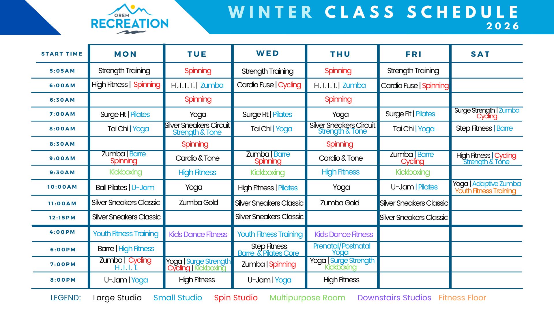 Amazing classes included with your Pass or daily admission! VIEW GROUP FITNESS SCHEDULE PDF View Group Fitness Class Descriptions PDF(A) View Group Fitness Class Descriptions PDF(B) VIEW WATER AEROBIC SCHEDULE PDF Click on any class below to see the instructor and class description. PRColors correspond to the room in which the class is located. Large Studio Small Studio Spin Studio Dance Studio/Fitness Floor MPR 1