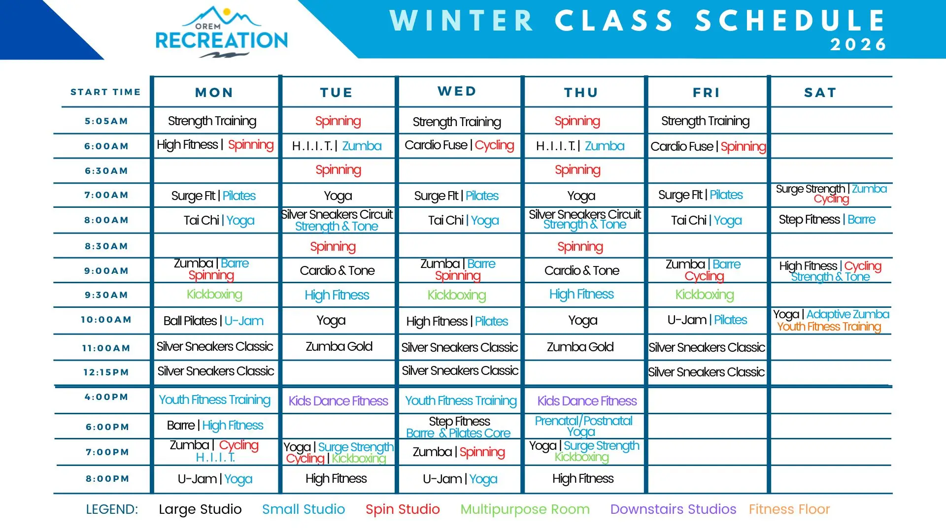 Amazing classes included with your Pass or daily admission! View Group Fitness Class Descriptions Colors correspond to the room in which the class is located. Large Studio Small Studio Spin Studio Dance Studio/Fitness Floor MPR 1 Click on any class below to see the instructor and class description.