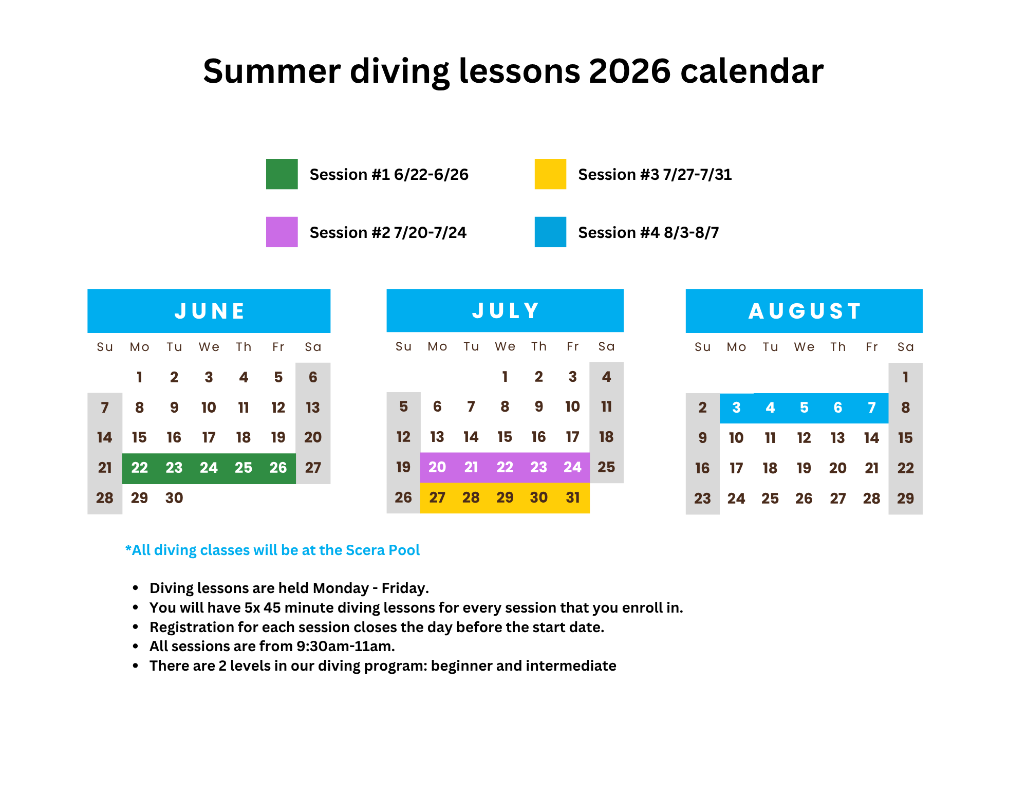Session #2 ONLY: Diving lesson on Pioneer Day, Friday July 24th, will take place at the Orem Family Fitness Center. Every other class will be at the Scera Pool