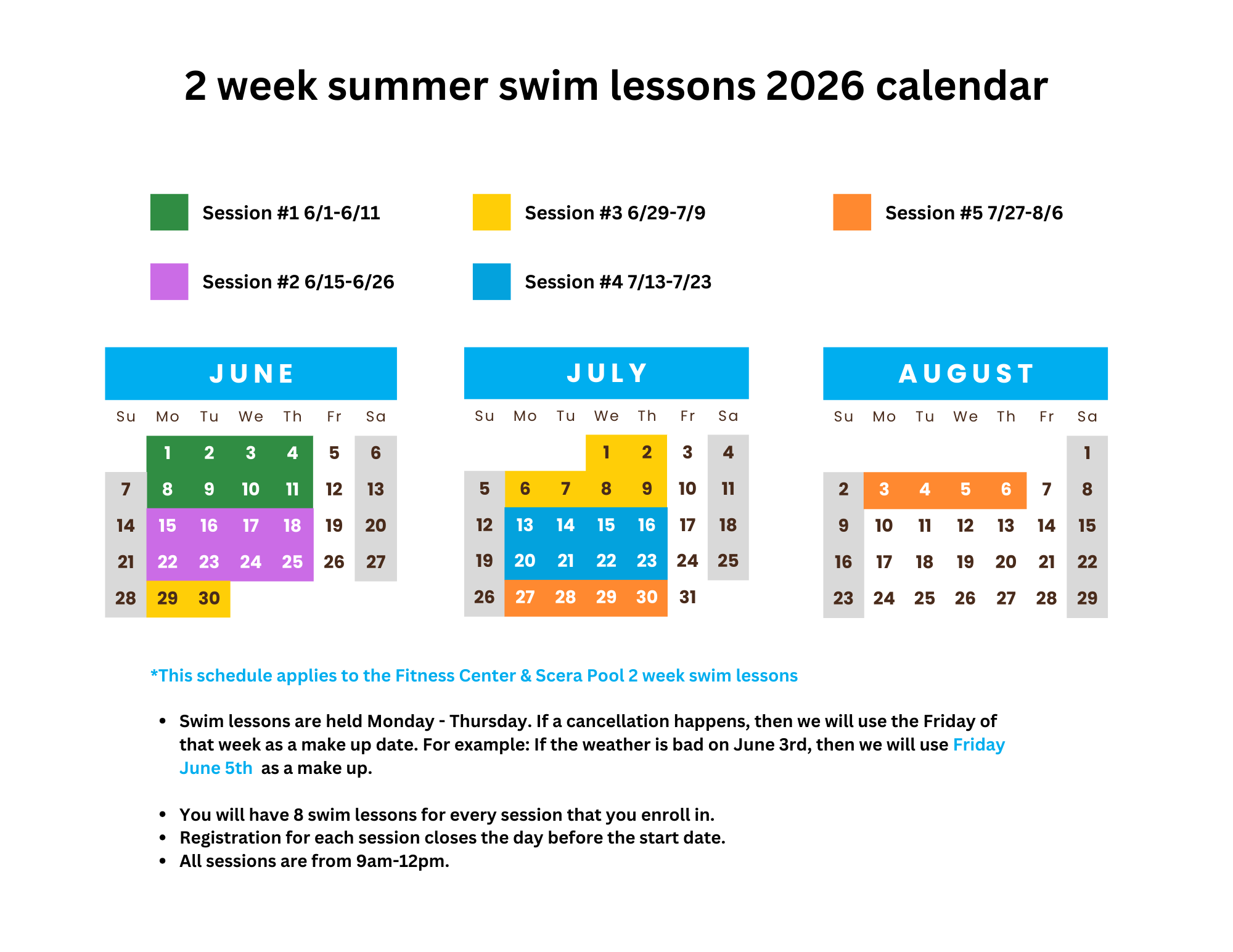 The Orem Family Fitness Center is now offering 2 week lessons (four 30 min lessons/week) during the summer of 2026. Classes will be held from 9am-12pm at the Scera Pool and the Orem Family Fitness Center. For further questions please contact our Aquatic Coordinator, Cameron, at crobinson@orem.gov.