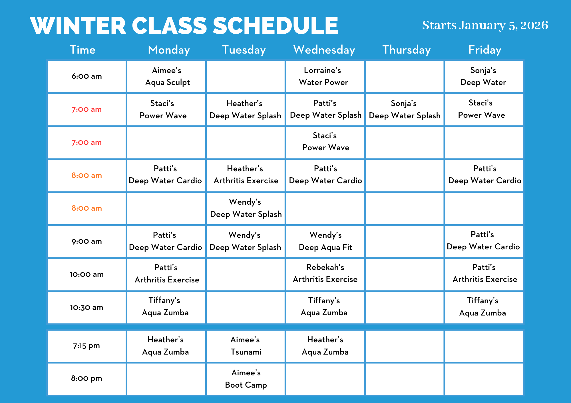 Wendy’s Deep Aqua Fit | Fun Cardio-style Deep water workout set to music that will get you moving. Targeting your whole body and range of motion through Cardio, HIIT, interval, and Strength training. This class caters to all skill levels from beginners to those looking for a high intensity workout. Floatation and resistance equipment provided. |